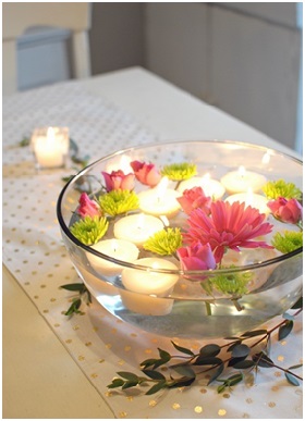 Nến tealight có thể thả nổi trên mặt nước nên bạn cũng có thể sử dụng những chiếc tô sứ, tô thủy tinh lớn đựng nước, thả lên đó những viên nến và những cánh tươi. Làn nước sóng sánh còn nến thì chập chờn trông thật thi vị phải không nào?