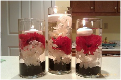 Bên cạnh hoa thì sỏi đá cũng là một phụ kiện không kém phần thú vị khi kết hợp với nến. Bạn có dùng những chiếc ly thủy tinh cao, rải sỏi trắng, đen hoặc sỏi đa sắc màu bên trong, đổ nước vào và thả lên trên một viên nến tealight nhỏ. Hiệu quả cũng thật tuyệt vời đúng không nào.